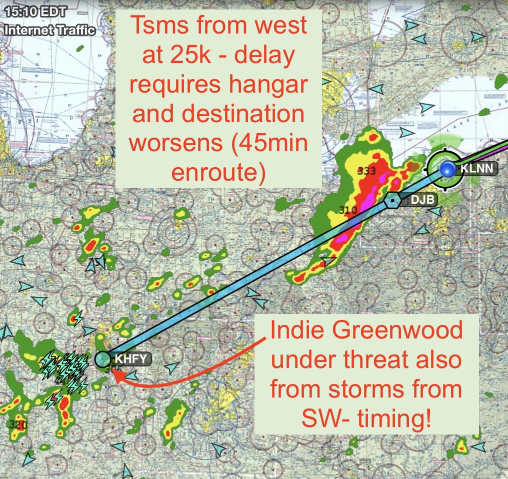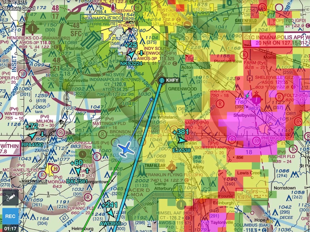 This week’s excitement was again at Lost Nation (now Lake County Executive) trying to get to Indianapolis Greenwood airport (KLHY) with the boss in back. This initially looked impossible with the convective ringing the airport (Plan A was park it in a hangar and ride it out). But timing is the key (and latency on both NexRad and ADS-B has to be accounted for.) Great cooperation from ATC made this both possible and safe (with an escape south always in our plans if it got ugly).
