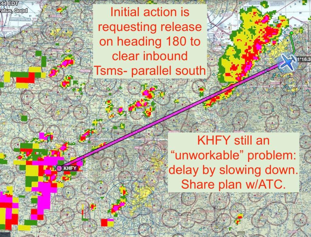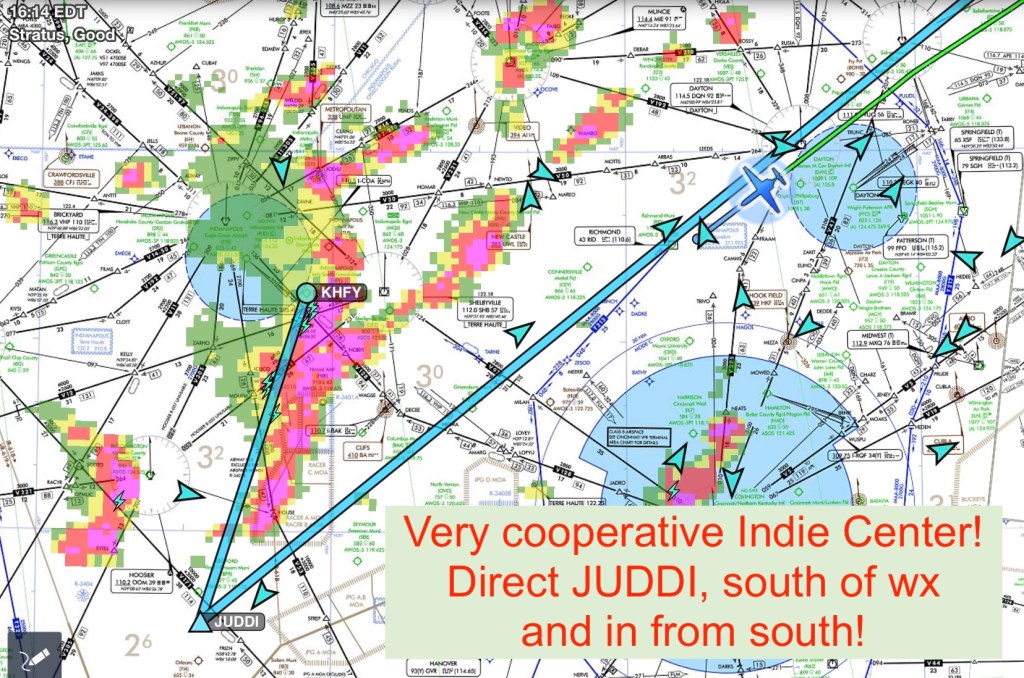 What made this work was good crew coordination and complete agreement (and ATC cooperation) on a plan. Indie Center worked with us and pointed out the hole for our cut north (our radar shows straight ahead and ADS-B/NexRad lag badly). We came in just behind the storm and had a visual approach – we never even got wet on this leg.